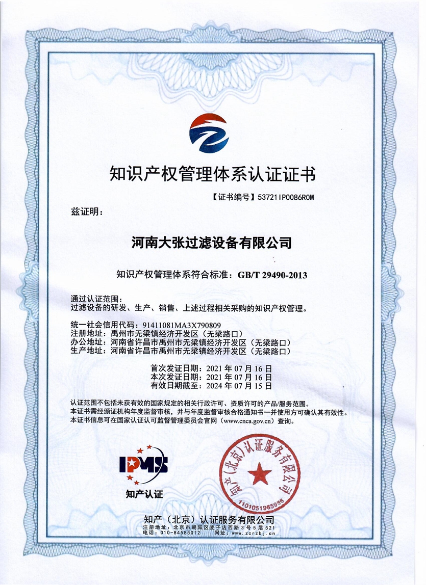 河南大張自成立以來,堅持以質(zhì)量求生存、以信譽求發(fā)展,先后通過了質(zhì)量管理體系、環(huán)境管理體系、職業(yè)健康安全管理體系及知識產(chǎn)權(quán)管理體系的認(rèn)證,河南大張及關(guān)聯(lián)公司先后獲得了“國家級高新技術(shù)企業(yè)”、“國家級第三批專精特新小巨人企業(yè)”、“國家級兩化融合管理體系評定證書”“河南省技術(shù)創(chuàng)新示范企業(yè)”、“河南省節(jié)能減排科技創(chuàng)新示范企業(yè)”、“河南省優(yōu)秀科技型企業(yè)”、“河南省文明誠信企業(yè)”、“河南省名牌產(chǎn)品”“河南省工業(yè)設(shè)計中心”“許昌市市長質(zhì)量獎提名獎”等稱號。公司始終堅持創(chuàng)新力求發(fā)展,技術(shù)改變世界,取得令人矚目的成果。2013年研發(fā)的“免加工密封式方形聚丙烯濾板”打破了中國市場被歐洲壟斷的局面;2015年成立的“河南省新型固液分離裝備工程技術(shù)研究中心”,是河南省一家從事固液分離裝備技術(shù)開發(fā)和應(yīng)用的專業(yè)機構(gòu);2017年成立的“河南省企業(yè)技術(shù)中心”證實了公司科技創(chuàng)新的實力和水平,2018年“高分子隔膜濾板智能自動化混料體系研發(fā)與產(chǎn)業(yè)化”、2019年“環(huán)保行業(yè)專用壓濾機的濾板關(guān)鍵技術(shù)研發(fā)及產(chǎn)業(yè)化”相繼被列入許昌市重大科技專項項目;2020年公司董事長張振利榮獲“全國優(yōu)秀農(nóng)民工”稱號。該年度公司被河南省科技廳認(rèn)定為“河南省高分子濾板先進材料工程技術(shù)研究中心”,參與制定壓濾機方面的團標(biāo)3件,修訂國家標(biāo)準(zhǔn)1件。其相關(guān)技術(shù)在國內(nèi)處于優(yōu)勢。2021年公司被河南省科技廳評為“河南省瞪羚企業(yè)”榮譽稱號。隨著實力的不斷增強,公司成為中國通用機械工業(yè)協(xié)會分離機械分會副理事長單位,同時為滿足市場上對壓濾機產(chǎn)品的需求。